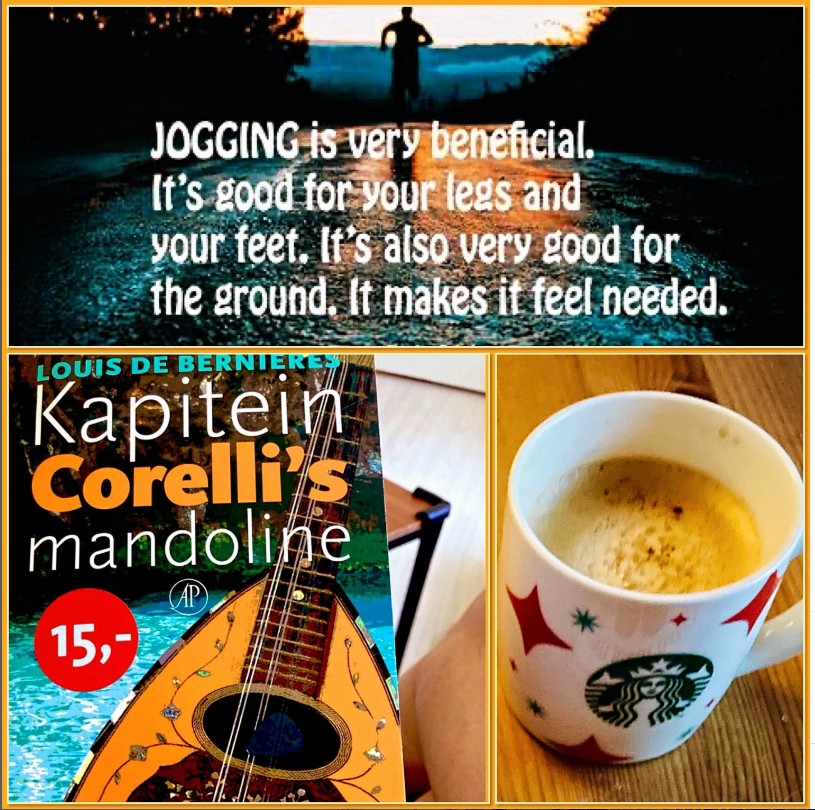 Op deze pagina dus mooie, interessante, niet begrijpelijke, of wat dan ook eerste zinnen uit gelezen boeken. Met het boek waar ik mee aftrap op deze pagina had ik het geluk dat het voor de helft van de getoonde prijs verkocht werd. Een puur boek pareltje ook, dat kan ik er wel bij verklappen. En omdat ik naast lezen ook graag jog en van koffie houd, is een en ander samengebracht in een collagefoto.